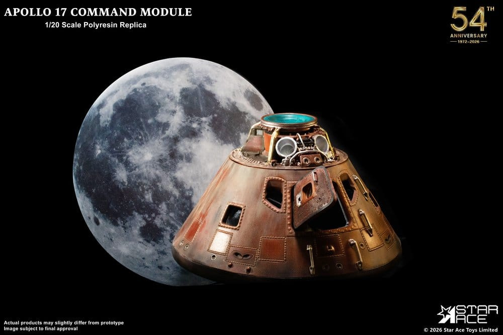 Mark the 54th anniversary of the last Moon landing with Star Ace's masterfully detailed Apollo 17 Command Module replica. Explore the pinnacle of human achievement with this meticulously designed polyresin replica crafted at 1/20 scale. Measuring 20cm in diameter, this intricately crafted model features a fully detailed interior and exterior, capturing the essence of the historic mission commanded by Gene Cernan and representing the last time humanity visited the moon. Mounted on a clear base with the full moon behind it, the module appears to be orbiting the moon one last time. The base also features a display plaque bearing the official NASA and Apollo 17 mission insignia. This is a definitive piece for serious collectors and space history aficionados and a stunning tribute to the Apollo 17 mission.