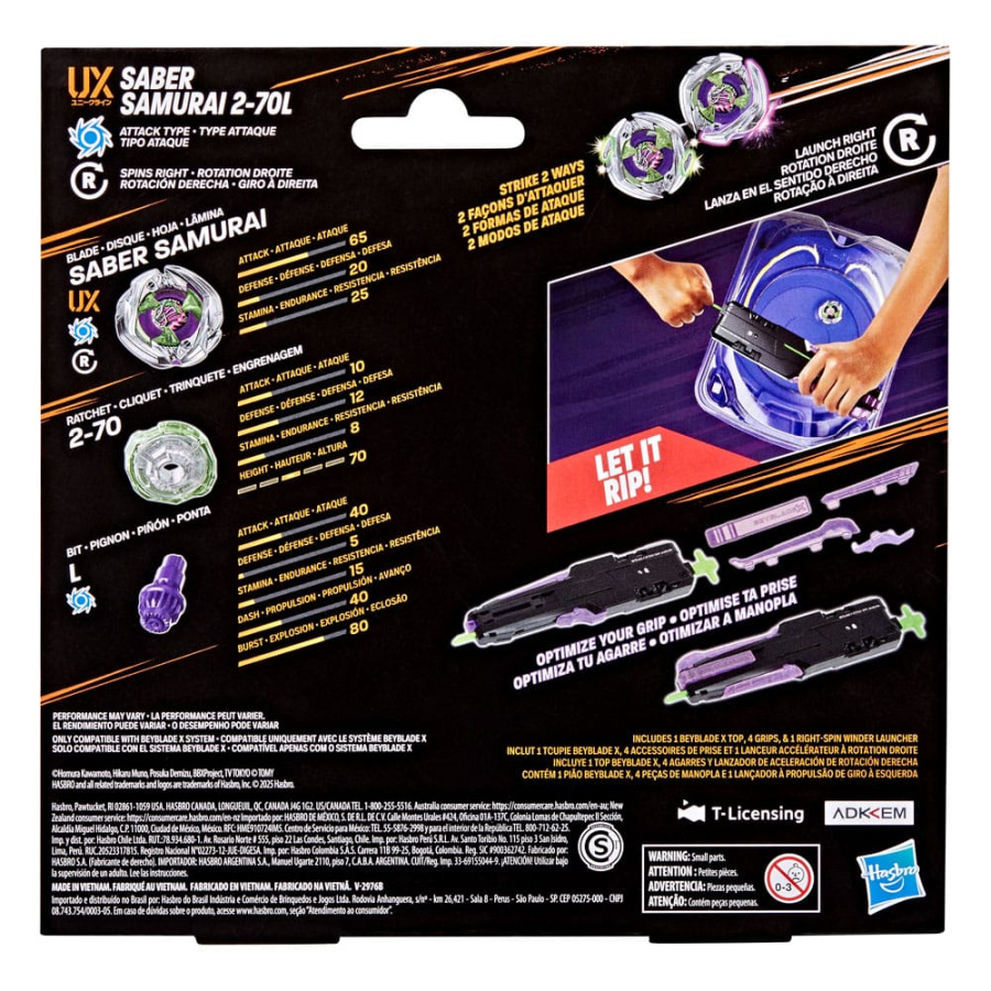 Experience Beyblade X, the next generation of Beyblade stadiums, launchers, and tops! The Victory Grip Launcher Set includes a right-spin launcher with a 10" (25cm) ripcord and customizable rubber grips. It comes with the Saber Samurai 2-70L Right-Spin Attack Type top, which works with the X-Celerator Gear System to level up your game and prove it in battle! When the top’s gear engages the X-Celerator Rail of a Beyblade X Beystadium (sold separately), it can super-accelerate into an Xtreme Dash around the arena for crushing collisions and epic bursts. Bladers launch their top against their opponent’s top to score points – first to 4 points wins. Mix and match the interchangeable blade, ratchet, and bit with those of other Beyblade X tops (sold separately) to create your own unsurpassable Bey. Hasbro Beyblade toys with authentic Takara Tomy die-cast metal tops make great kids gifts for boys and girls ages 8 and up.