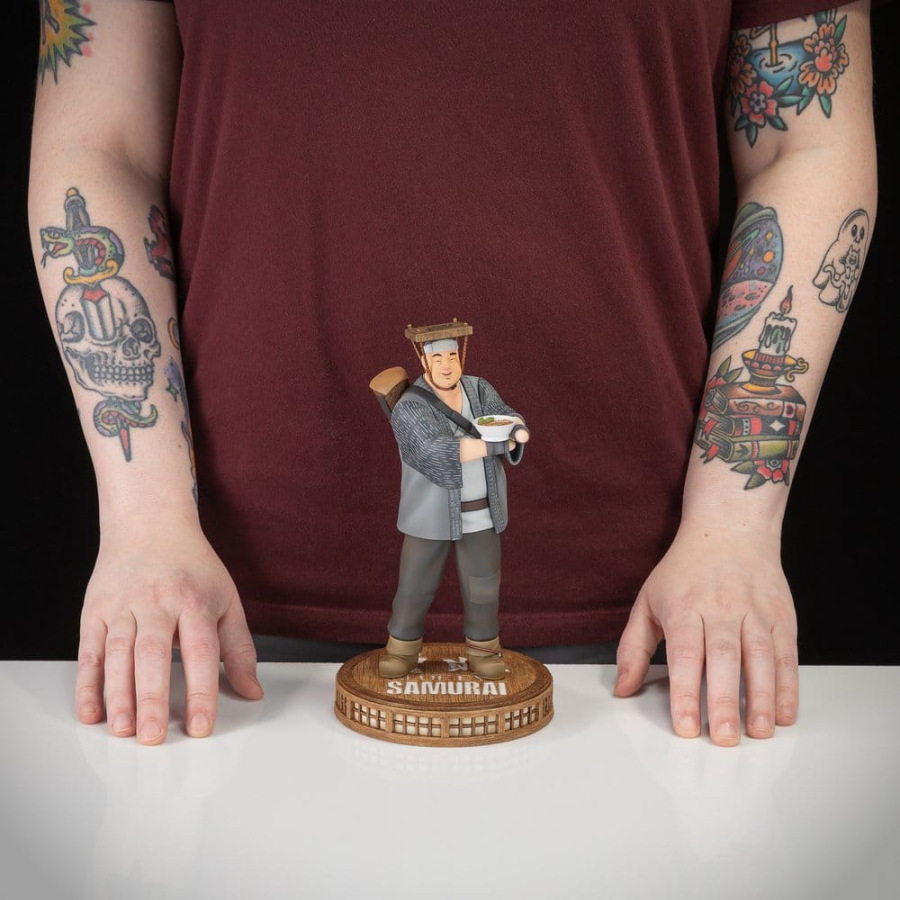 In the masterfully rendered Netflix animated series Blue Eye Samurai, Ringo is a soba maker and cook, in pursuit of the perfect bowl of noodles and eager for adventure. His kind, cheerful, and determined demeanor makes him a captivating character. This 8.35" tall figure captures Mizu's faithful apprentice at his most content, holding a bowl of delicious soba. Don't miss your chance to own one of Blue Eye Samurai's most beloved characters!