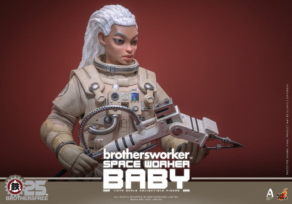 The sixth-scale Space Worker Baby Collectible Figure features a newly developed Baby head sculpt with separate rolling eyeballs and topped with soft white cotton material hair, giving the figure a distinctive, stylized charm. Standing at 27.5cm tall, the figure features fully articulated joints and comes with four interchangeable gloved hands - including a pair of relaxed hands for casual poses, and a pair of tool-holding hands for maintenance and action poses.