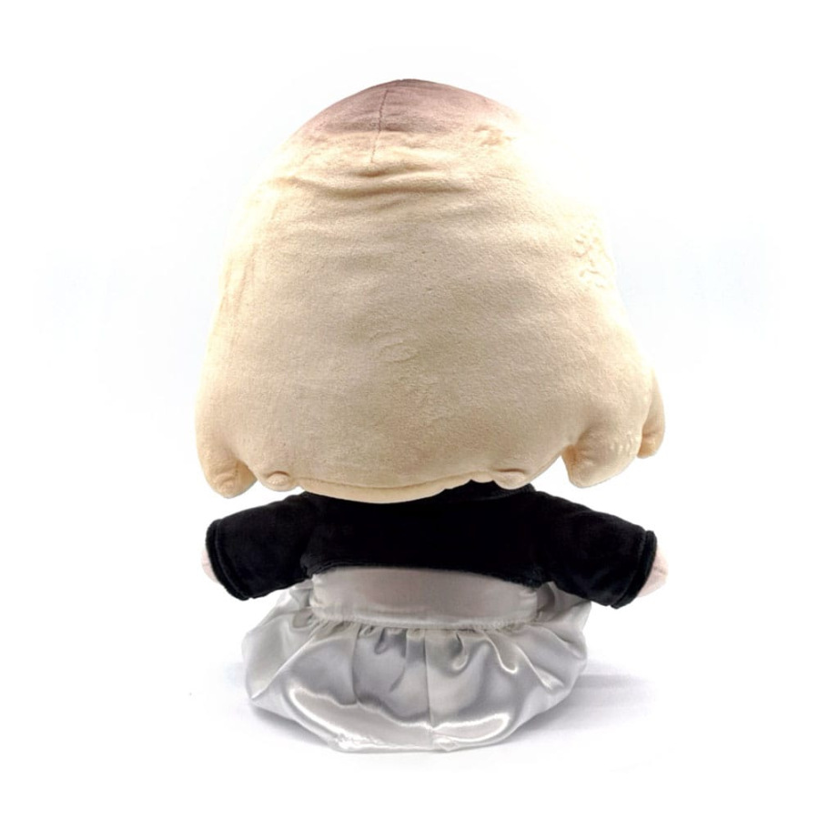 Calling all short kings, the woman, or doll of your dreams has arrived this Halloween season with an all-new look! Tiffany Valentine is making her debut as a Youtooz plush and she looks killer! Sitting at 9 inches tall with her feet kicked forward, Tiff is dressed in black boots under a white wedding gown along with an edgy black jacket and a yellow chain necklace that says "Tiff" around her neck. With platinum blonde hair that has dark roots falling down to her shoulders and framing her face, she has an evil smirk as a dark smokey eye is paired with a dark lip. This plush is packed to the seams with 100% PP cotton and is made of normal and sublimated minky materials, felt, and satin, perfect for cuddling or serving killer looks with!