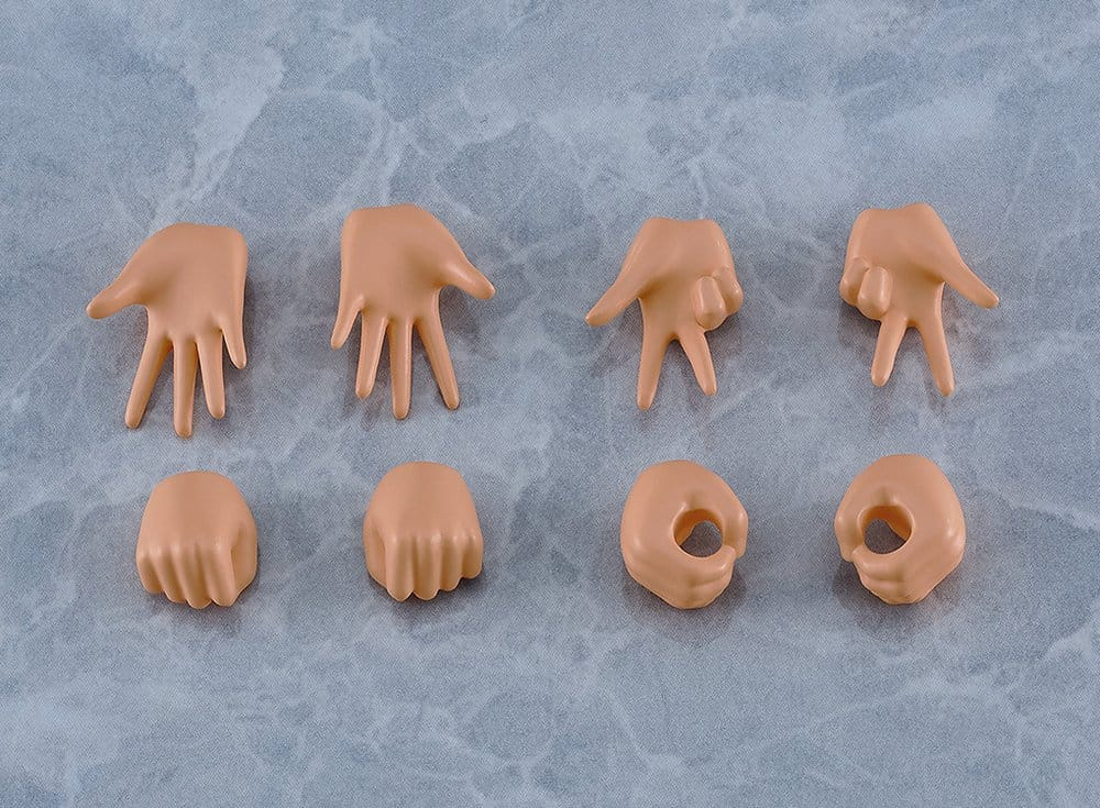 - The model comes with four types of hand parts: closed hands, open hands, peace sign hands and gripping hands. The holes for the gripping hands measure 3mm in diameter, allowing the model to hold items that are compatible with the hole size.
