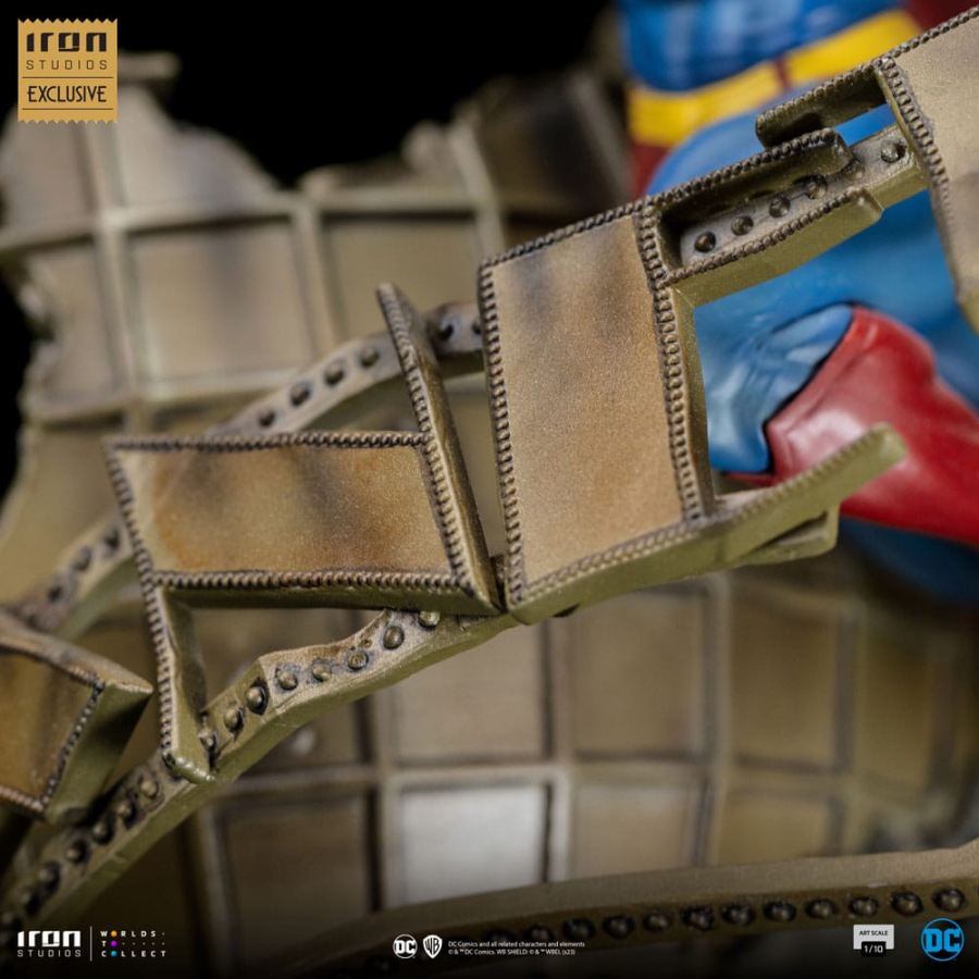 In a set of complete chaos and destruction in the streets of Metropolis, amidst concrete hubris and rebars, among twisted metal girder with the letters of the rest of the globe logo of the Daily Planet newspaper, two titans from planet Krypton fight in a deadly combat. On one side, the superhero of the superheroes, Earth's protector and defender, wearing his unmistakable blue and red classic costume, showing off with pride the coat of arms of his biological family on his chest, a shield in the shape of a diamond symbol of justice and hope. On the other side, an out-of-control brutal monster, a creation from the insane and irresponsible mind of a geneticist, born from an inhuman experiment, enhanced with pain and violence to be an instrument of pure destruction. Inspired by one of the most emblematic stories of the Man of Steel in the comic books, Iron Studios proudly present the statue "Superman vs Doomsday - DC Comics Iron Studios Exclusive 10 Years - Art Scale 1/10", one of the exclusive releases celebrating the 10 years of Iron Studios, that portray some of the most praised and award-winning Legacy Replica 1/4, Battle Diorama 1/6, and Prime Scale 1/3 statues