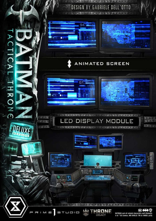 The Deluxe Version is where we truly pushed ourselves to the limit to offer you something that's never been seen before. Behind Batman are not one, but four illuminated monitors, displaying various details including tracking systems that help our Caped Crusader in his pursuit of justice within Gotham City. With this version, two additional left arms are provided, allowing you to change the angle as well as the way his elbow lays on the armrest. An additional cape and an unmasked Bruce Wayne portrait are also included.