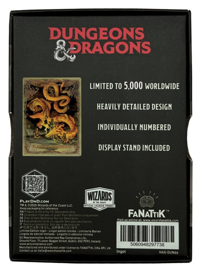 Limited to just 5,000 pieces worldwide, each ingot is individually numbered along the bottom edge and housed in a specially designed collector's box complete with its own presentation stand. Finished in antique gold plating and deeply embossed, it offers a faithful, tactile tribute to one of Dungeons & Dragons' most iconic rulebooks.