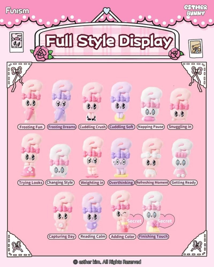 This display comes with 6 collectible figures from 'Esther Bunny'. The figures are approx. 6 cm tall and are packaged in blind bags. There are 14 characters and 2 secret character to collect.
