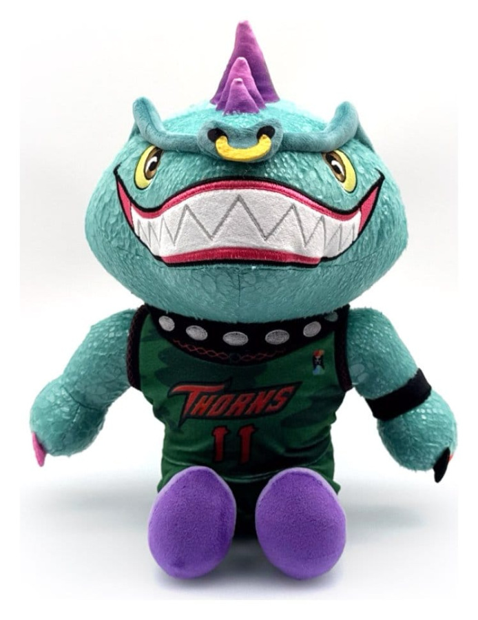 Can you hear the crowd roar? Feel the intensity of the teams?! A Roarball game must be about to kick off! Modo has pounced off the field and into Youtooz for his plush debut! Sitting at 9 inches tall and wearing purple sneakers with black flames along with a green camo Thorns uniform over his Komodo Dragon skin, dark green scales speckle his shoulders and face as a sharp toothed grin stretches under yellow eyes. With sharp purple horns creating a mohawk over his head, he's accessorized with multicolored nails, a black armband and a gold septum piercing as a long tail relaxes behind him. This plush is packed to the seams with 100% PP cotton and is made of minky, tricot and faux lizard skin materials with accents of felt, perfect for cuddling or playing Roarball with!