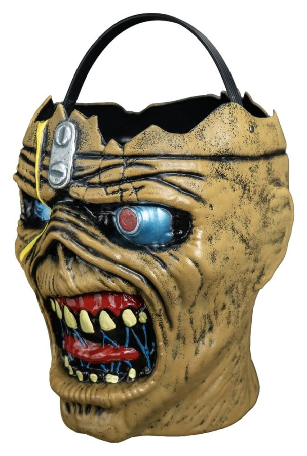 The pail features a sculpted Eddie head design with painted details and a flexible plastic handle, making it perfect for Halloween treats, collecting, or display. Stands approximately 9" tall with a 7" opening.