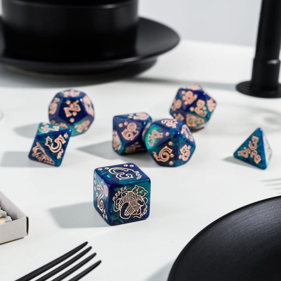 First to appear outside the Kickstarter campaign, this big-sized dice set is colored with a mix of green and blue hues.