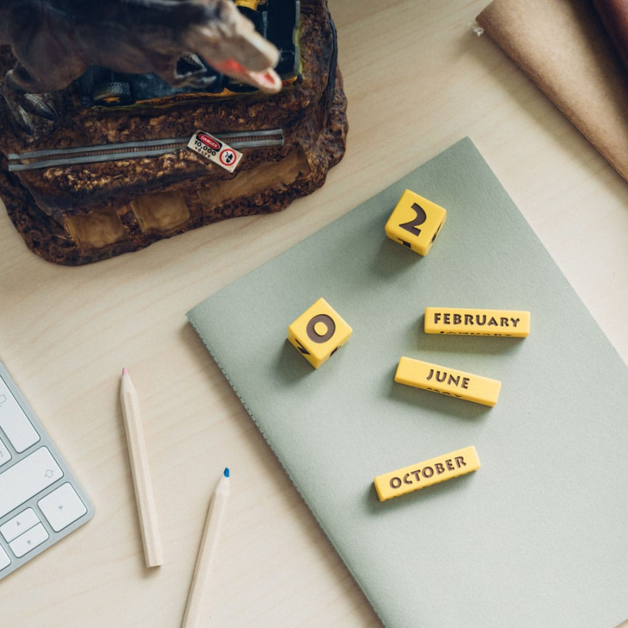 The calendar consists of 5 blocks with days and months that can be swapped and combined to create all possible dates.