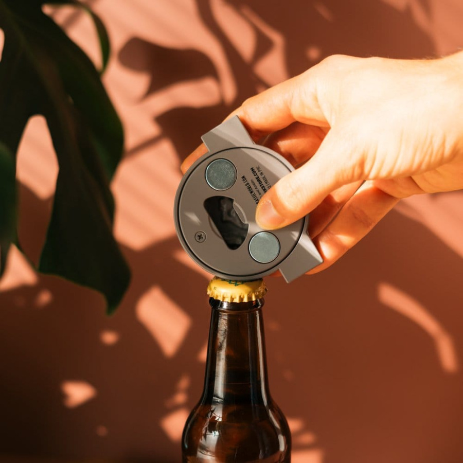 - It has a bottle opener and several magnets on the back that allow it to be attached to the refrigerator or any magnetic surface
