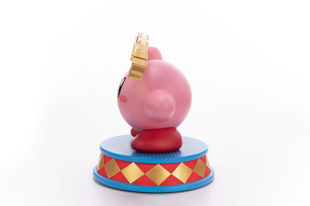 To go with this dynamic statue, the base has triangles on the sides. It has been plated with red and gold hues, making the structure more dynamic. The gold plating has a reflective finish, making it look shiny, and makes the spherical aspect of Kirby stand out!