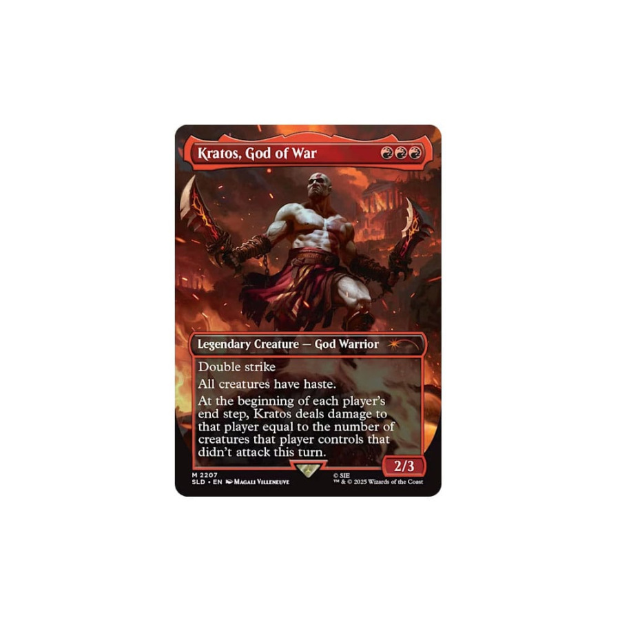 And now, he can become your commander! The Secret Lair x God of War: Greek drop contains a new design for Kratos, seen in his war against the Greek gods, in a mono-red drop that illustrates his fiery rage and Spartan heritage. Kratos always wants to go on the offensive, so grant him the blessing of extra combat steps with World at War as "Battle of Olympus," then harness your fury with cards that represent the legendary weapons powerful enough to take down the divine like "Blades of Chaos Bond," "Hades Grip," and "Kratos' Rage."