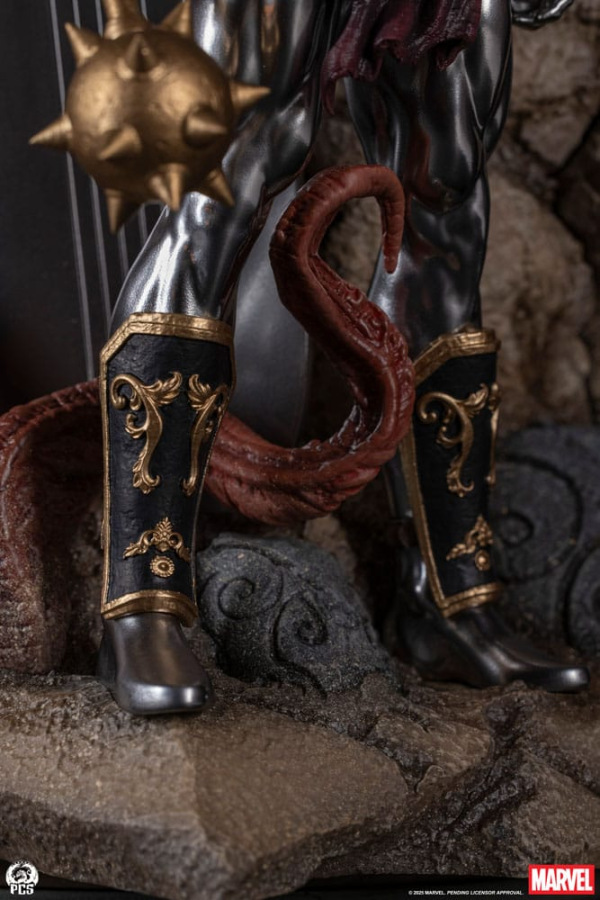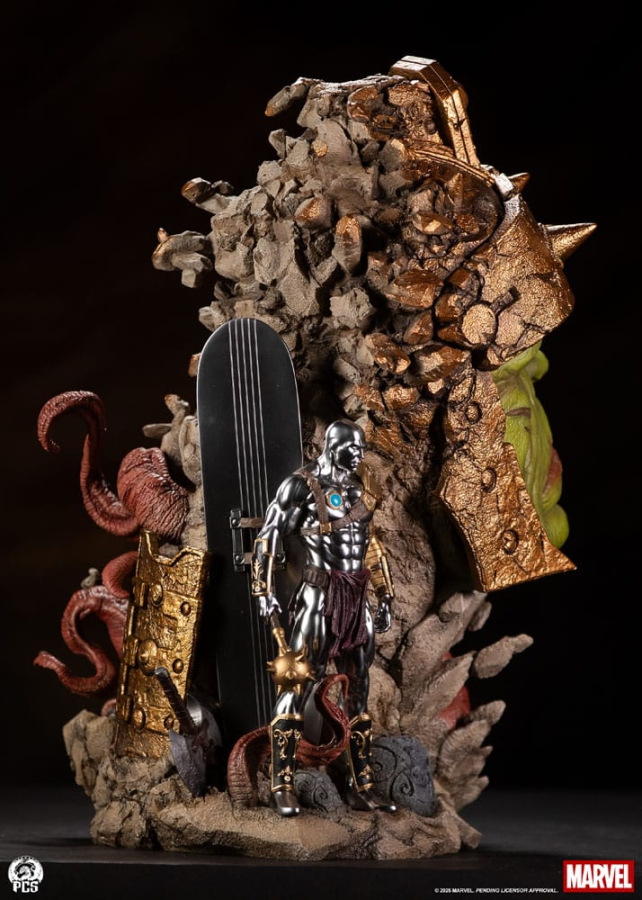 Standing 22" high, this exceptionally unique collectible centers on a stoic portrait of the displaced hero which transitions gradually into a rocky surface reminiscent of the harsh surface of the battleworld, Sakaar. Surrounding the portrait is a scene of the heavily armored Hulk battling a vicious "Devil Corker", a gorgeously detailed and fully armored Savage Surfer as well as a selection of weapons and armor used in their iconic gladiator match.