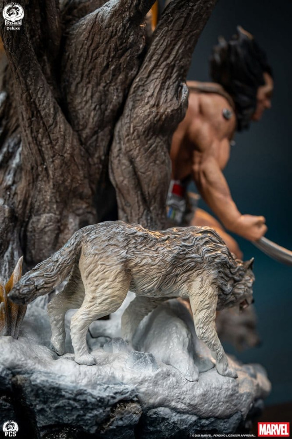 The Weapon X scene features the feral test subject trudging through the snow with his claws bared and a pair of wolves at his sides. On the other side of the bust Wolverine is shown in full costume, leaping into battle against his arch enemy Sabretooth. This Deluxe Edition features Wolverine in his classic brown and yellow costume.
