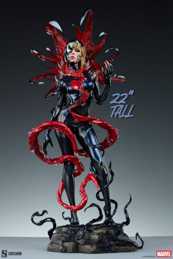 It's a takeover ... and a makeover! The Gwenom Premium Format™ Figure measures 22 inches (55.8 cm) tall, 10.5 inches (26.2 cm) wide, and 8 inches (20.3 cm) deep, striking a stunning juxtaposition between Gwen Stacy's violence and vulnerability. She is corrupted yet empowered as the liquified symbiote merges with her feelings - and fashion sense. Her hood bears salivating fangs like an oversized Venus flytrap, while the slimy symbiote creates a bodysuit and heels for its host. Gwenom's entire sense of self has been warped and distorted through a venomized lens, and she can be seen smirking even as an alien anger consumes her.