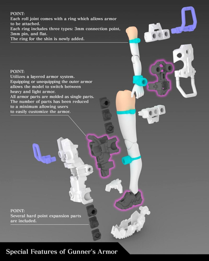 - The 3mm connection points on each part and head compatibility parts allow this model to be customized with existing M.S.G, Frame Arms, Frame Arms Girl, Hexa Gear, Sousai Shojo Teien, and Arcanadea series parts.