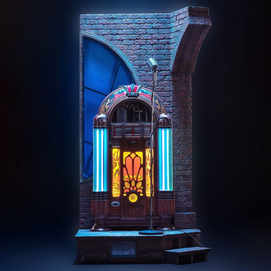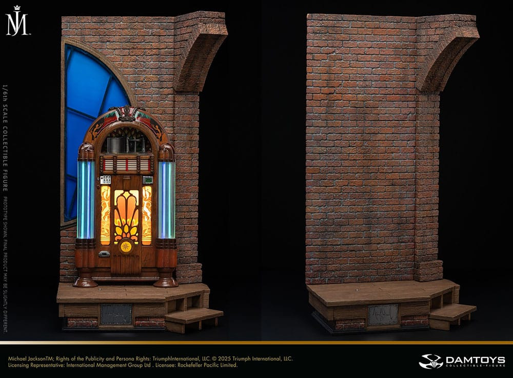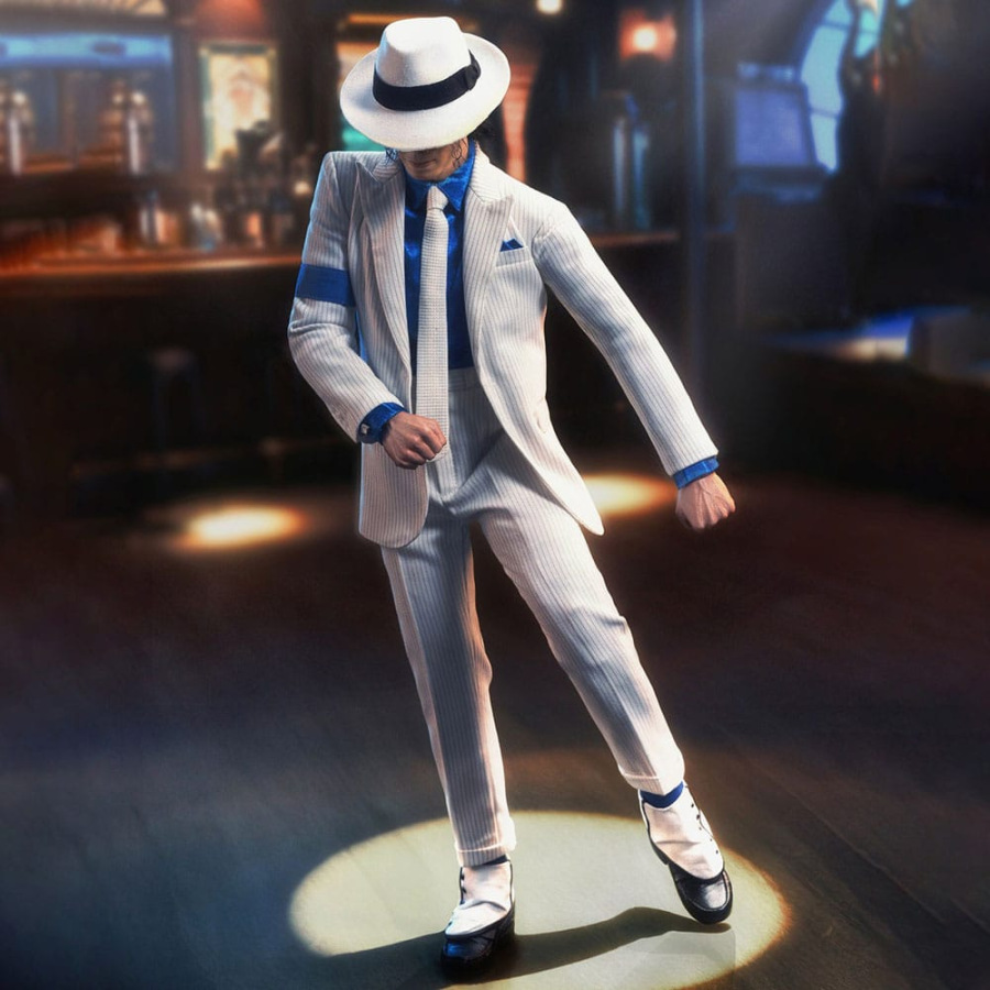 The product features the outfit Michael Jackson wore in his "Smooth Criminal" short film. With flawless reproduction detailing. Every element, from the texture of the costume's patterns and the vintage details of the diorama base and jukebox that recreates the set from the short film.