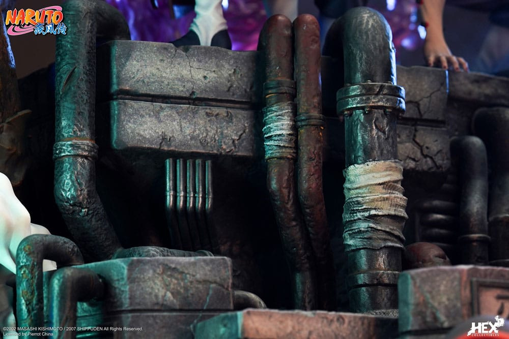 Beneath their feet lies a breathtaking depiction of the unique architecture of the Village Hidden in the Rain. The metallic sheen on pipes and bricks lends a lifelike quality, enhancing the overall realism. Giant multi-head dog and snake-tailed chameleon are summoned around them, while at the backside, the King of Hell opens its large mouth in anticipation of souls. Wreathing the entire diorama, flames and smoke merge with the enveloping darkness, giving an extremely impressive feeling to the whole statue.