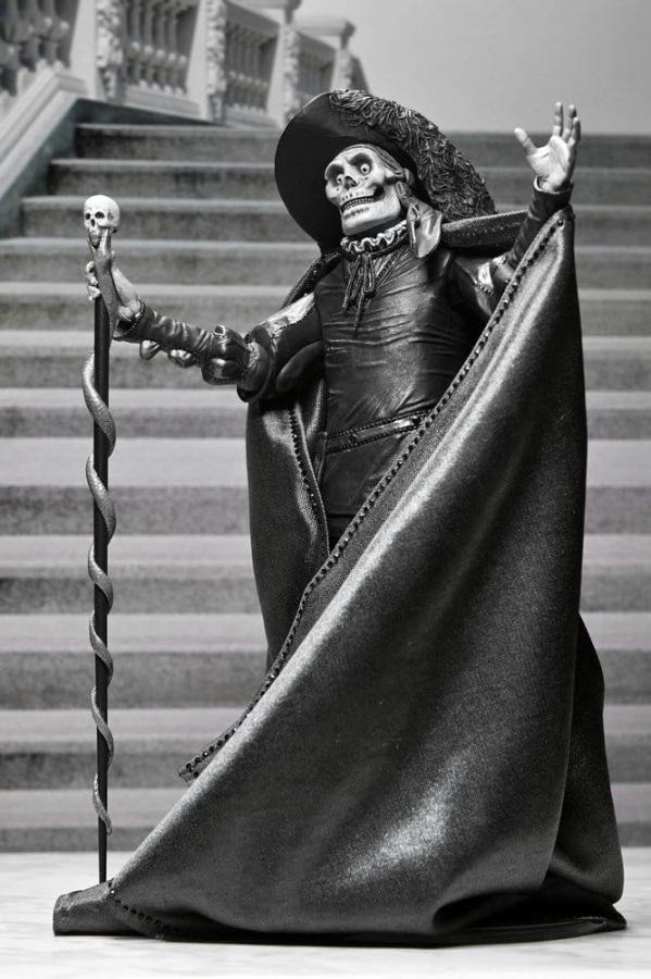 Celebrate over a century of cinematic horror! Mark the 101th anniversary of the 1925 silent film The Phantom of the Opera with this stunning action figure in classic black and white from NECA. Looking as if he just stepped off the silver screen, this 7-inch scale figure of the Phantom (Erik) in his iconic "Red Death" disguise from the masquerade ball captures the haunting elegance of Lon Chaney’s classic portrayal. Hiding his disfigured face beneath the skull mask, he spies on Christine and Raoul on the rooftop of the Paris Opera House. This collectible includes a soft goods cloak, large brim hat, and skull staff accessories. Plus, multiple heads and hands, which are interchangeable with other NECA Phantom of the Opera figures (sold separately). Presented in a collector-friendly box with an opening front flap, this figure is a must-have for horror fans and classic film collectors alike! Size: 17.8 cm (7.00")