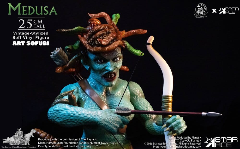 The hunt begins! Star Ace proudly unveils the next stunning release in our vintage-style soft-vinyl figure series-the terrifying Medusa, rising from the mythic depths of the 1981 classic Clash of the Titans. Officially licensed as part of the Ray Harryhausen Collection, this serpent-haired Gorgon slithers onto your shelf in bold retro sofubi style.