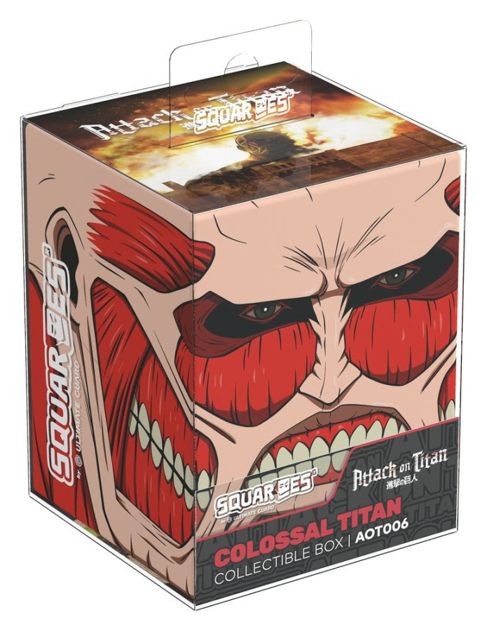 Collectible box for storing TCG decks, tabletop gaming accessories, and/or collectibles. The Colossal Titan Squaroe from the Attack on Titan edition holds up to 100 cards in double protective sleeves if used as a deck box. Squaroes are made from 78% renewable resources and fit perfectly into the separately available Collectors Case.