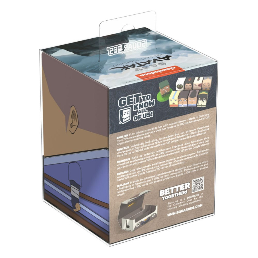 Collectible box for storing TCG decks, tabletop gaming accessories, and/or collectibles. The Sokka Squaroe from the Avatar: The Last Airbender™ edition holds up to 100 cards in double protective sleeves if used as a deck box. Squaroes are made from 78% renewable recources and fit perfectly into the separately available Collectors Case.