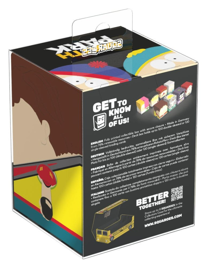 Collectible box for storing TCG decks, tabletop gaming accessories, and/or collectibles. The Captain Diabetes Squaroe from the South Park™ edition holds up to 100 cards in double protective sleeves if used as a deck box. Squaroes are made from 78% renewable resources and fit perfectly into the separately available Collectors Case.