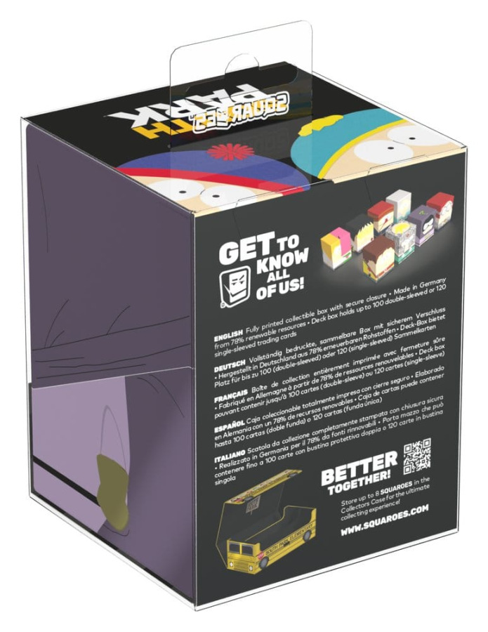 Collectible box for storing TCG decks, tabletop gaming accessories, and/or collectibles. The Mysterion Squaroe from the South Park™ edition holds up to 100 cards in double protective sleeves if used as a deck box. Squaroes are made from 78% renewable resources and fit perfectly into the separately available Collectors Case.
