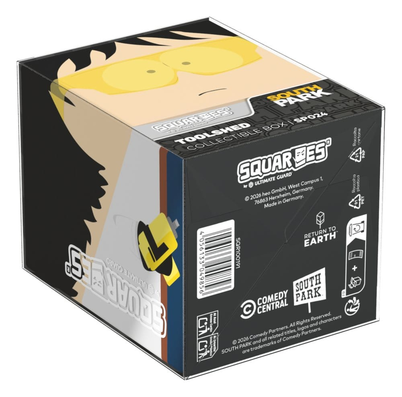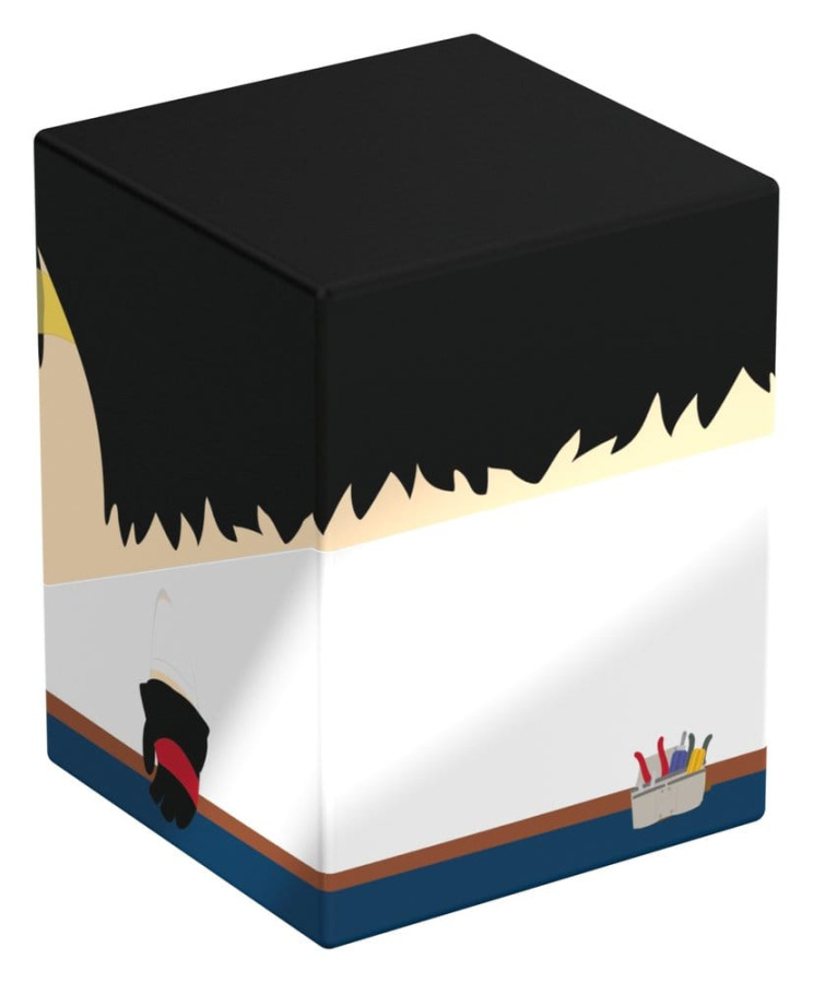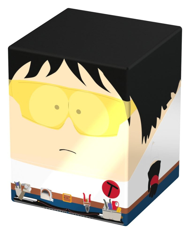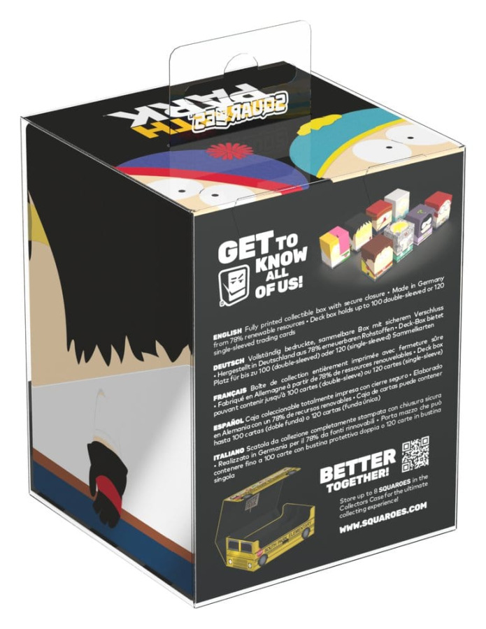 Collectible box for storing TCG decks, tabletop gaming accessories, and/or collectibles. The Toolshed Squaroe from the South Park™ edition holds up to 100 cards in double protective sleeves if used as a deck box. Squaroes are made from 78% renewable resources and fit perfectly into the separately available Collectors Case.