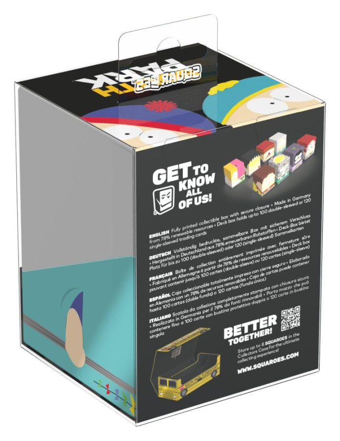 Collectible box for storing TCG decks, tabletop gaming accessories, and/or collectibles. The Human Kite Squaroe from the South Park™ edition holds up to 100 cards in double protective sleeves if used as a deck box. Squaroes are made from 78% renewable resources and fit perfectly into the separately available Collectors Case.