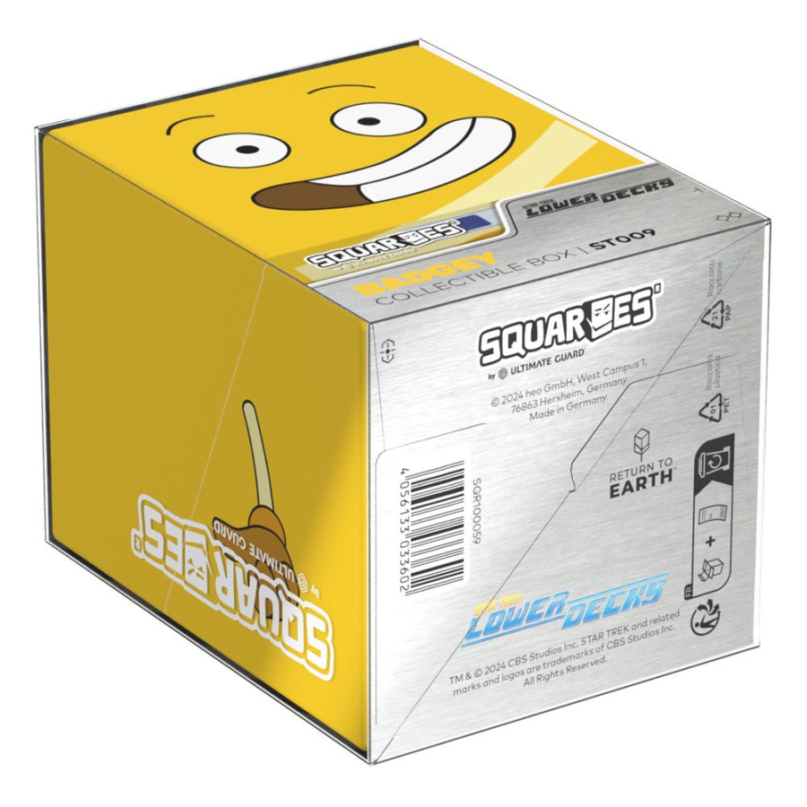 Collectible box for storing TCG decks, tabletop gaming accessories, and/or collectibles. The Badgey Squaroe from the Star Trek: Lower Decks™ edition holds up to 100 cards in double protective sleeves if used as a deck box. Squaroes are made from 78% renewable resources and fit perfectly into the separately available Collectors Case.