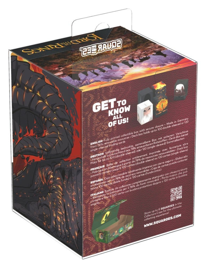 Squaroes by Ultimate Guard are the next generation of TCG gaming accessories! Crafted from high-quality, 78% sustainable materials they combine outstanding card protection with collectibility through exclusive designs, limited one-off printings, and deck boxes available in varying rarities. The The Lord of the Rings Squaroes hold up to 100 standard- or Japanese-sized trading cards (from games like Magic: The Gathering, Pokémon, Lorcana, Flesh and Blood, Yu-Gi-Oh!, Riftbound, and One Piece) in double protective sleeves*. As a new spin on Ultimate Guard's fan-favorite Boulder deck box, Squaroes offer an ultra-sturdy case with a secure closure, while staying easy and convenient to open.
