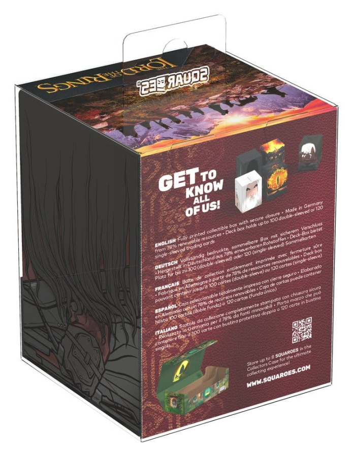 Squaroes by Ultimate Guard are the next generation of TCG gaming accessories! Crafted from high-quality, 78% sustainable materials they combine outstanding card protection with collectibility through exclusive designs, limited one-off printings, and deck boxes available in varying rarities. The The Lord of the Rings Squaroes hold up to 100 standard- or Japanese-sized trading cards (from games like Magic: The Gathering, Pokémon, Lorcana, Flesh and Blood, Yu-Gi-Oh!, Riftbound, and One Piece) in double protective sleeves*. As a new spin on Ultimate Guard's fan-favorite Boulder deck box, Squaroes offer an ultra-sturdy case with a secure closure, while staying easy and convenient to open.