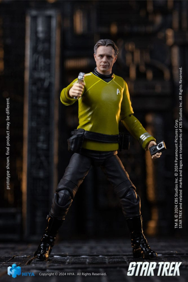 This brand-new Pike action figure stands at 10.5CM tall and faithfully reproduces his appearance in the 2009 film, Star Trek. He is dressed in the iconic yellow uniform representing command and strategic personnel. The Starfleet emblem on his clothes, communicator, phaser, and other accessories are all finely detailed, capturing the essence of his character even at the 1/18 scale.