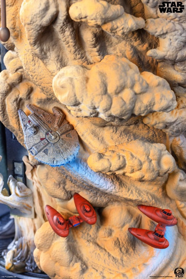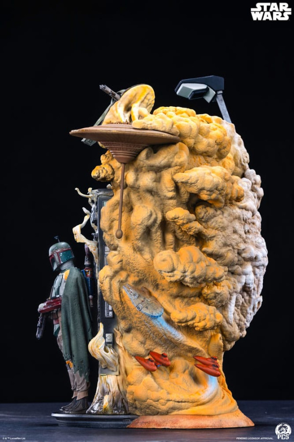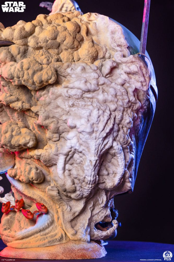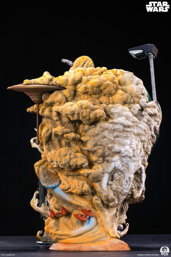 The Boba Fett Fine Art Bust stands over 20" high and centers on a faithful recreation of the bounty hunter's iconic helmet. Surrounding the helmet are beautifully sculpted scenes depicting important moments in this fan-favorite character's history including the tragedy of his childhood and his pivotal capture of the rebel, Han Solo. The bust also includes a recreation of Cloud City, the floating metropolis that serves as the setting for so many beloved story moments, wreathed in orange clouds that transition to an ethereal vision of the Mandalorian crest seeming to form in the atmosphere.