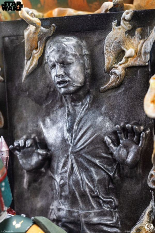 The Boba Fett - Fine Art Bust features LED light up features to add an extra sense of excitement and drama to this already staggering piece. The warm glow emanating from beneath the floors of the carbonite freezing chamber illuminates a highlight of this piece, a statue of the disquietingly stoic Boba Fett standing beside his frozen quarry.
