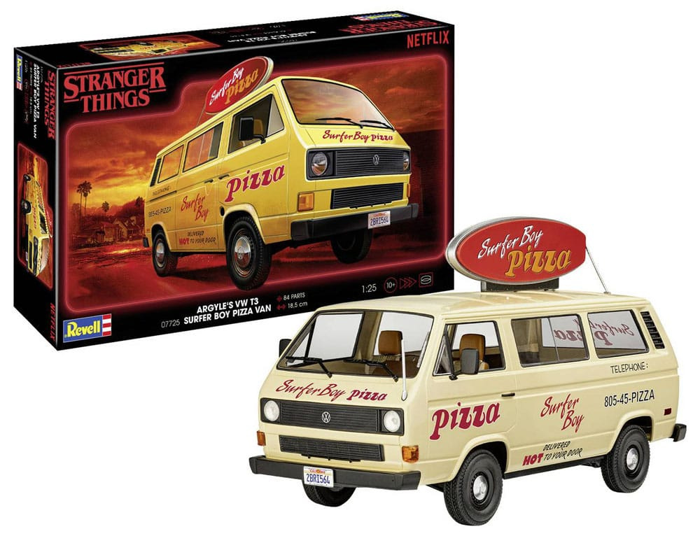 The VW T3 printed with the slogan "Surfer Boy" is known from the fourth "Stranger Things" season and is available as a kit for beginners. Scale 1:25. 96 parts. 185 mm length. Suitable from 10 years.