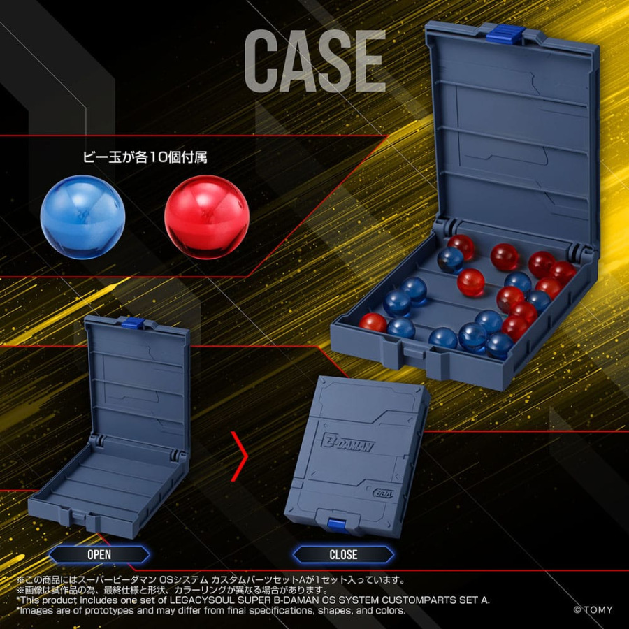 A container case set for storing marbles is included. The B-DAMAN and JBA logos are engraved on it. The molding color is blue-gray.