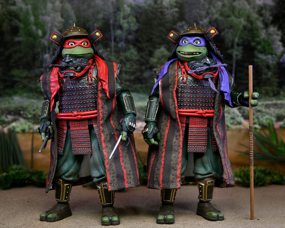Complete your NECA TMNT movie trilogy collection with these incredible action figure 2-packs from Teenage Mutant Ninja Turtles III! Get Donatello and Raphael in their samurai attire as totally radical 7-inch scale action figures. The figures come with interchangeable hands, 2 oni masks, 2 sais, bo staff, and a Time Scepter. Window box packaging.