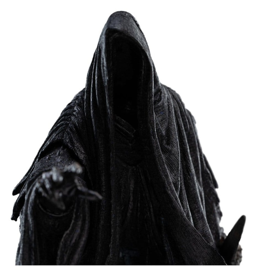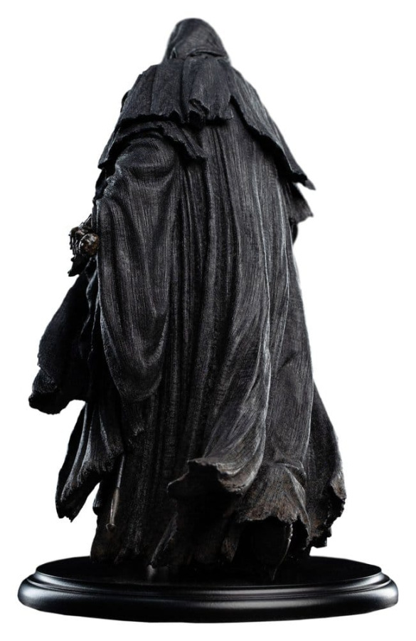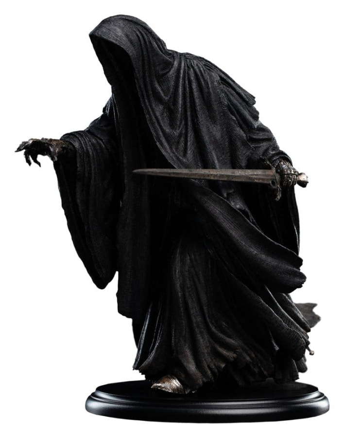 Captured in a moment of near-tragedy, this miniature Ringwraith statue immortalises one of the most chilling episodes in The Fellowship of the Ring: the silent strike at the Prancing Pony. Our artists bring exceptional narrative clarity to this compact form. The flowing, unnatural drape of the cloak suggests movement without wind; the posture is poised between stealth and violence. Fine textural detailing across the armour, wrappings, and weathered blade rewards close inspection, while the elongated silhouette and restrained composition preserve the Ringwraith’s inhuman menace. This collectible pairs seamlessly with other Ringwraith pieces, anchors dioramas dedicated to the forces of evil, or stands alone as a symbol of the Nine at the height of their terror.