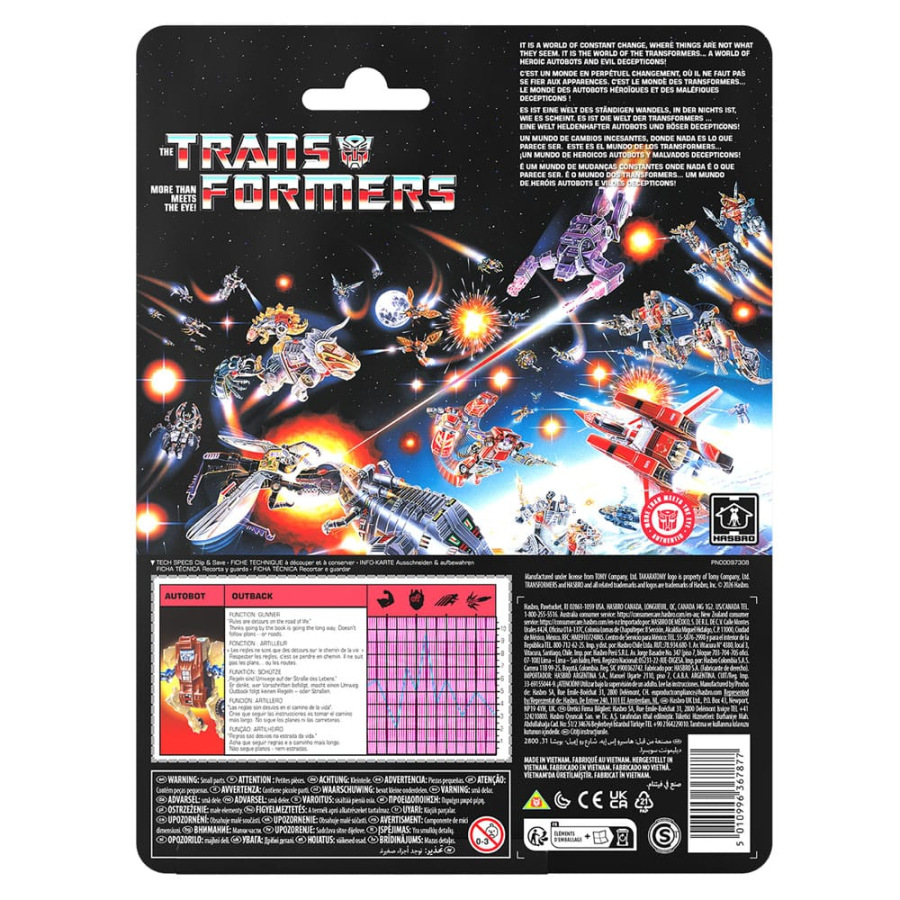 Add some nostalgia to your Transformers collection with the Retro G1 Autobot Outback figure. Toy converts from 5-inch (12.5 cm) robot to truck in 23 steps and comes with an attachable blaster accessory. Retro-style packaging features vintage-inspired design and clip-and-save tech specs for figure. Look for more Retro G1 Transformers collectible toys (sold separately, subject to availability) featuring favorite characters like Autobot Wheelie, Wheeljack, Autobot Brawn, and more to create a lineup that is — More Than Meets the Eye.