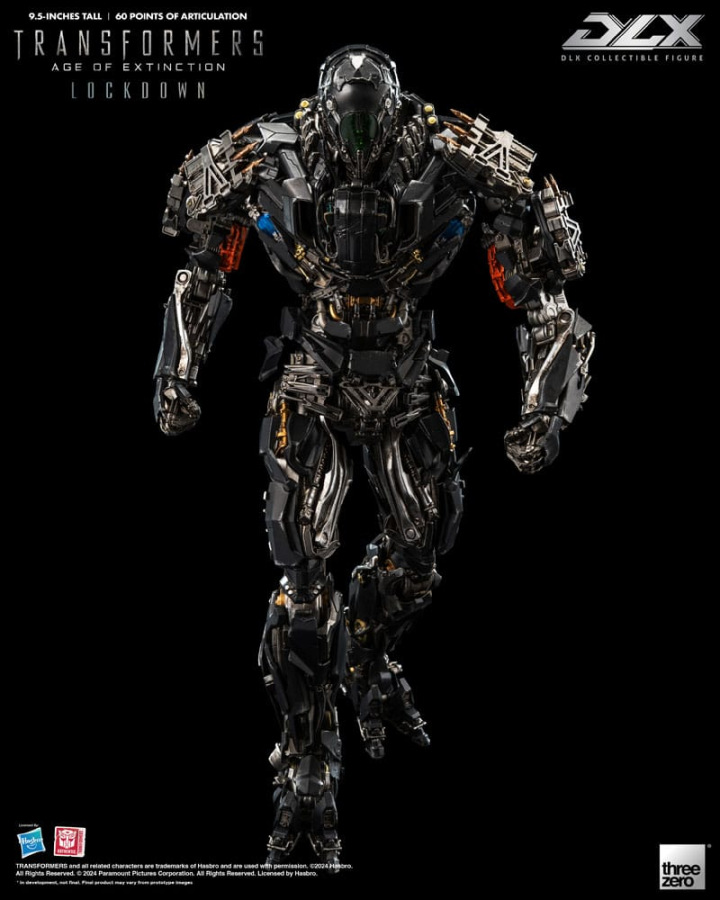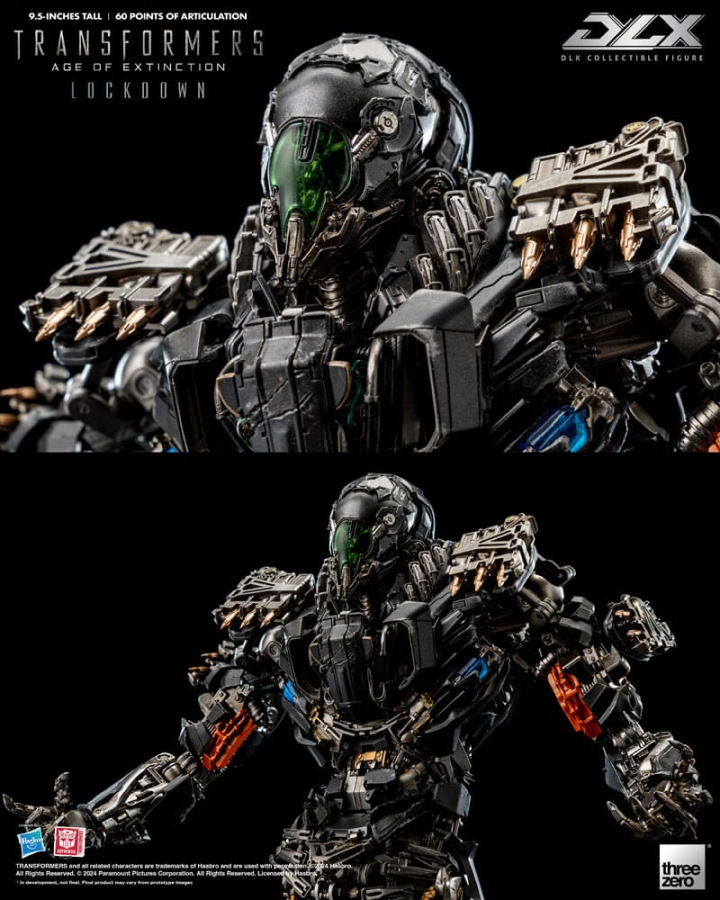 Standing approximately 9.5 inches (~24cm) tall, Transformers: Age of Extinction DLX Lockdown has approximately 60 points of articulation and features die-cast metal parts with an engineering-grade plastics frame, which allows for a dynamic range of poseability, durability, and excellent stability. DLX Lockdown features an incredibly detailed sculpt with threezero's signature weathered paint application in order to replicate the appearance as seen in the movie, numerous weapon accessories grant the ability to recreate various battle scenes.