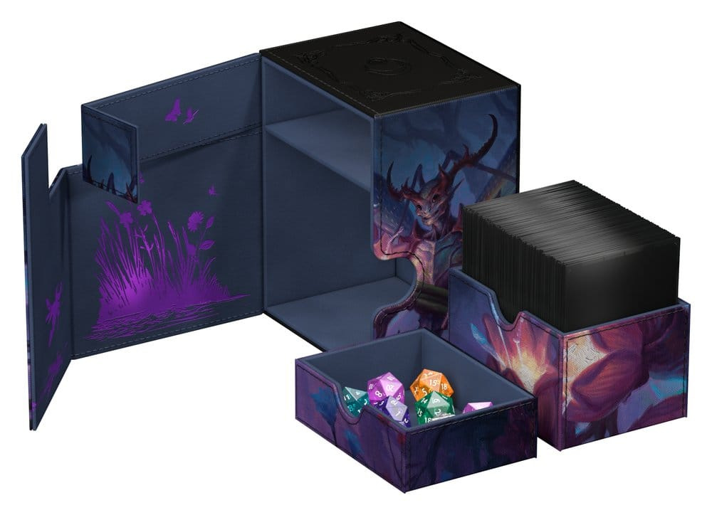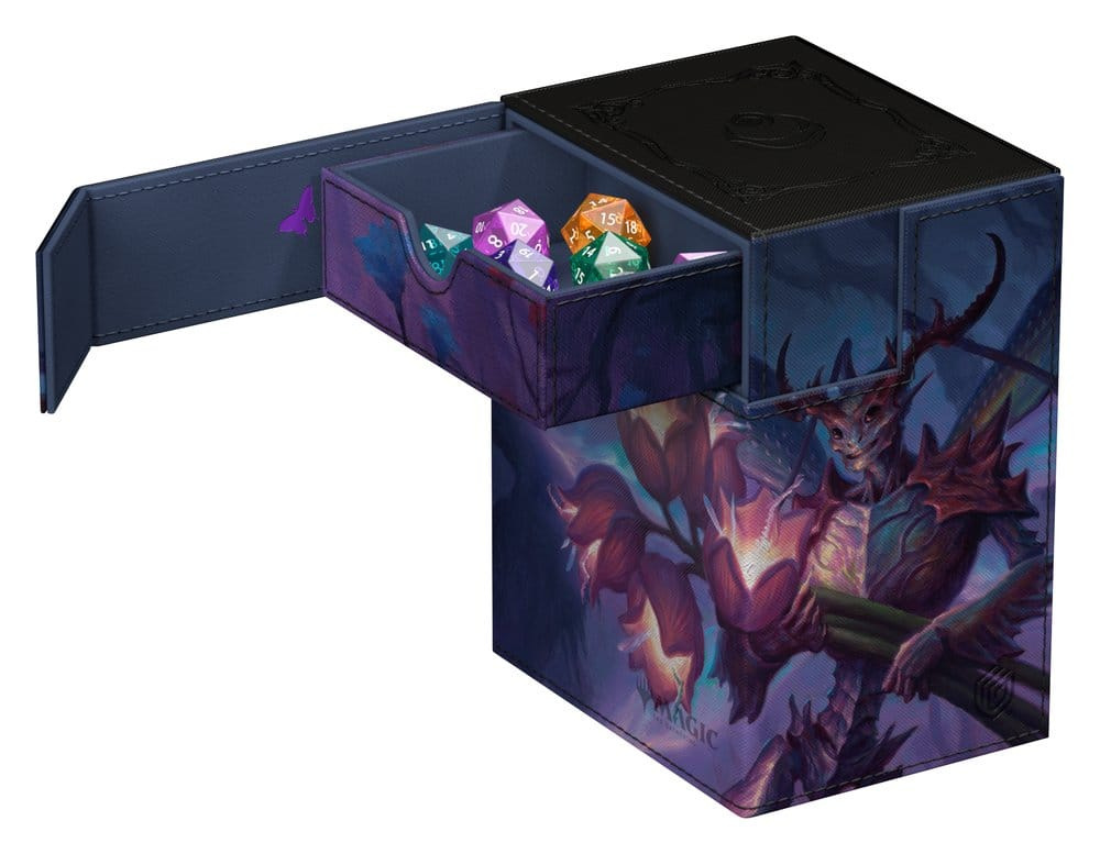 Ultimate Guard's Flip'n'Tray 133+ Xenoskin is a premium MTG deck box for all Magic formats (Commander/EDH, Modern, Standard, etc.) featuring two independently accessible trays — one for 133 double-sleeved cards in Ultimate Guard sleeves* and one for dice and accessories. Printed with officially licensed artwork from Magic: The Gathering's "Lorwyn Eclipsed" set, the Flip'n'Tray features durable Xenoskin material, a microfiber inner lining, and strong magnetic closures that guarantee exceptional card protection. Designed to combine with other Ultimate Guard products, this deck box can hold a Boulder 100+ when the card tray is removed.