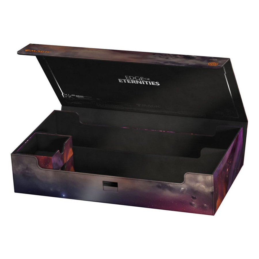 The Omnihive 1000+ Xenoskin, featuring officially licensed MTG art from "Edge of Eternities", is a mass storage box designed to hold multiple deck boxes, dice and/or Play-Mats at once—or alternatively a large collection of single cards (up to 1000 double-sleeved). The two practical and flexibly positionable magnetic trays inside are, like the outside of the box, made of full-color printed and resistant Xenoskin material and have a quality microfiber inner lining. The lid of the Omnihive 1000+ Xenoskin is secured with strong magnets and an additional ZnapClaw mechanism.