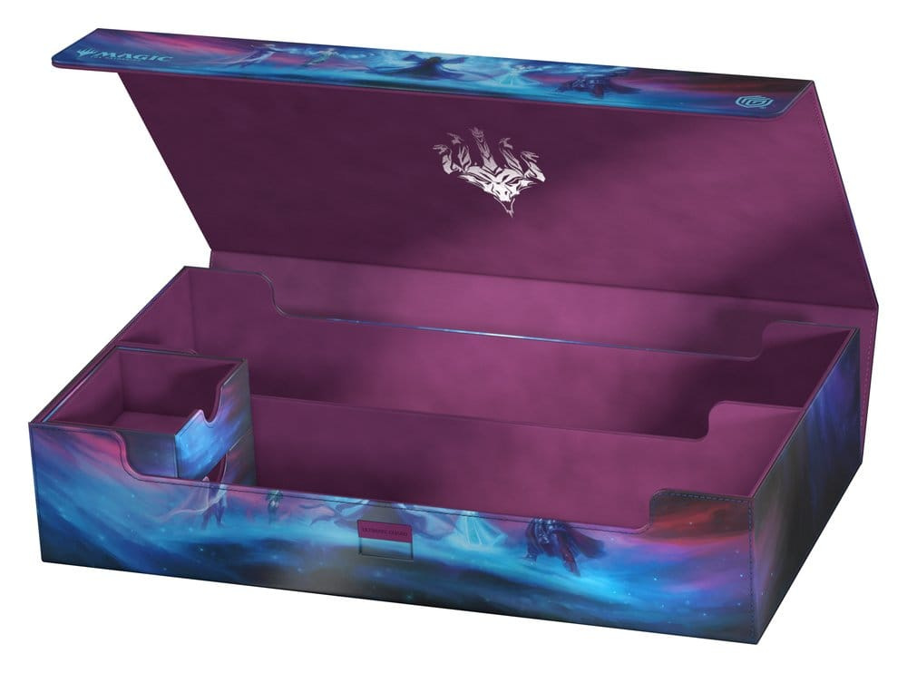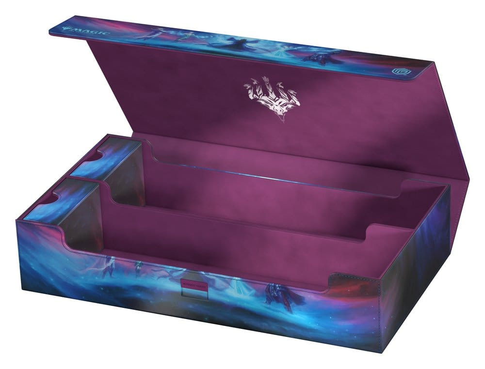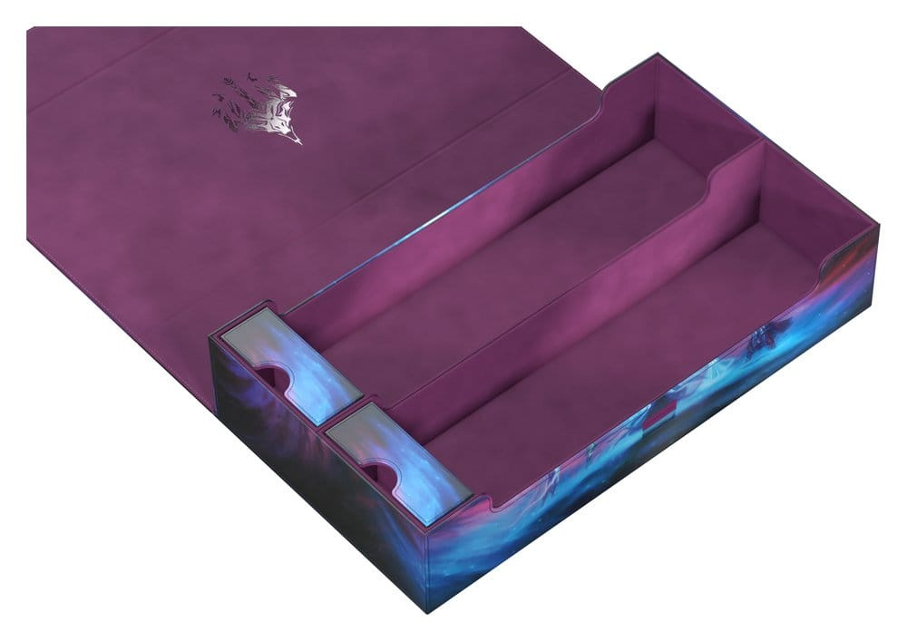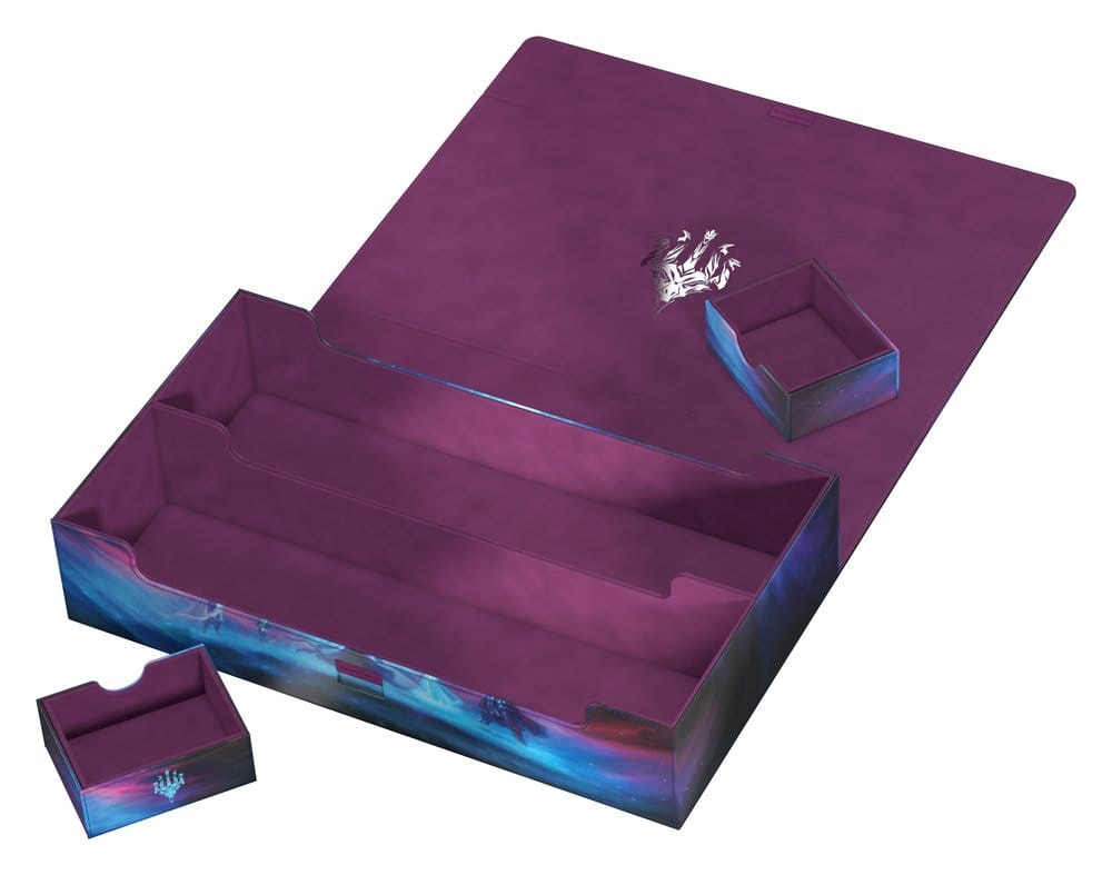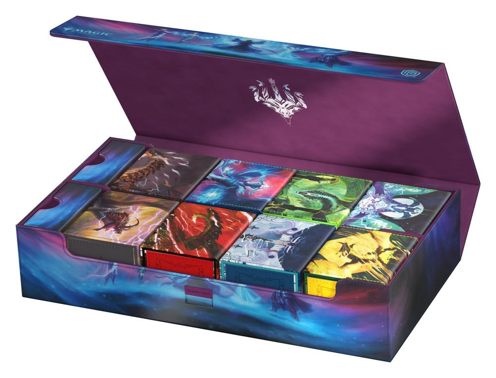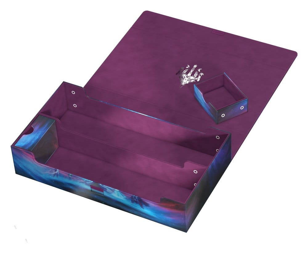 The Omnihive 1000+ Xenoskin gathers the mighty spirit dragons of Tarkir on a single deck box! Designed with two large main compartments and two flexibly positionable magnetic trays, the Omnihive can store up to 1000 single cards (double-sleeved), multiple deck boxes, accessories like dice, and/or play-mats simultaneously. The durable Xenoskin surface features the artwork Call the Spirit Dragons by Liiga Smilshkalne from Magic: The Gathering’s Tarkir: Dragonstorm set. The lid of the Omnihive is secured with strong magnets and our ZnapClaw mechanism, while the microfiber lining inside provides extra protection for cards, deck boxes, and accessories.