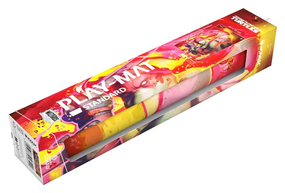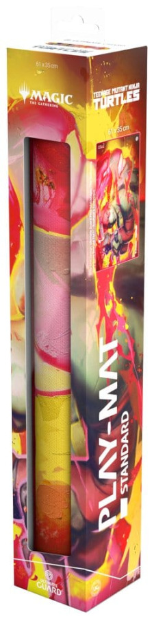 Ultimate Guard's Play-Mat Standard, featuring officially licensed artwork from the "Magic: The Gathering | Teenage Mutant Ninja Turtles" set, is a high-quality, 61 x 35 cm MTG playmat that enhances the gaming experience and protects MTG cards, sleeves, and accessories from scratches, wear, and dirt. The 2 mm thick, soft-cushioned playmat is made from natural rubber and features Ultimate Guard's trusted anti-slip underside and a high-quality, soft fabric surface. The gaming mat's stitched edges prevent fraying and ensure long-lasting durability.