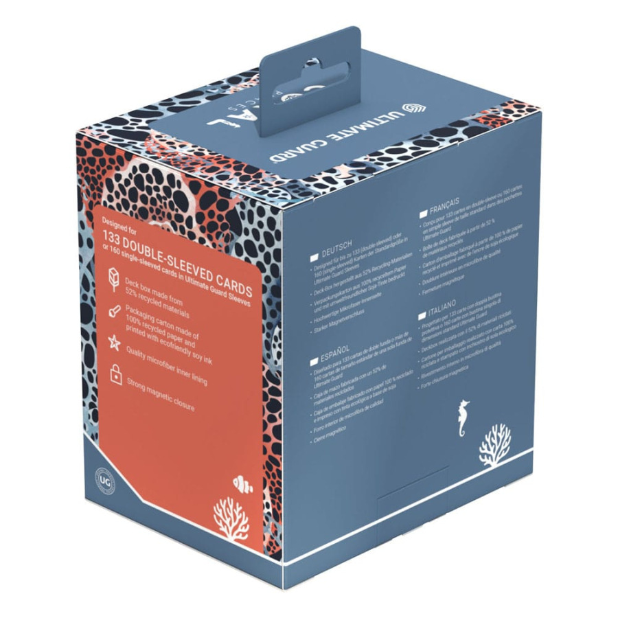 Dive into flourishing underwater worlds with Ultimate Guard's Coral Places Sidewinders! The sustainable deck boxes are made from 52% recycled materials and, in addition to the durable Xenoskin surface, have a strong magnetic closure and a high-quality microfibre inner lining. With a capacity of 133 double-sleeved cards*, it's the perfect MTG deck box for your Commander deck with extra space for tokens! The plastic-free packaging is also made entirely from recycled paper and cellulose-based film.