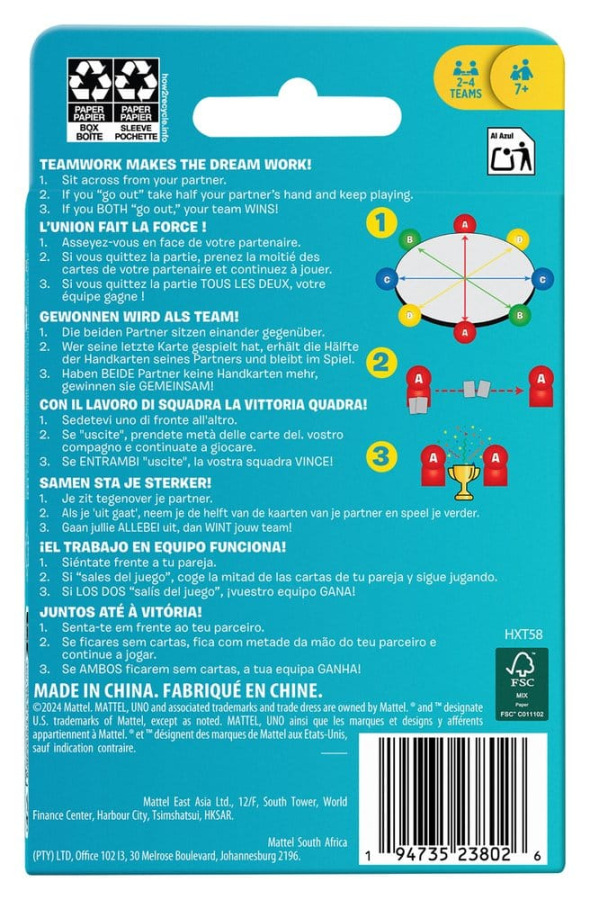 UNO Teams offers a new way to play the classic game. Players still have to find matching colours, numbers and symbols. Instead of playing against each other, they play in teams of two and try to win together. Special cards and rules make it easier for team members to work together. However, both players must discard all the cards in their hands to win. Don't forget: when a player (or their partner) has only one card left, shout "UNO"!
