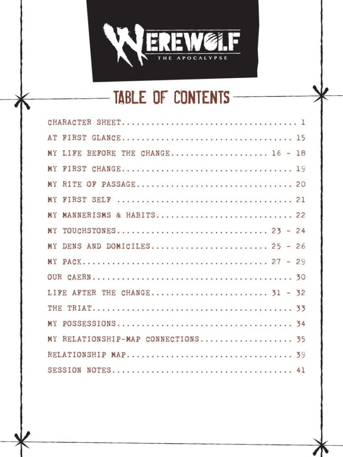 Sing the song of your Werewolf character and chronicle with the Werewolf: The Apocalypse Expanded Character Sheet Journal. This book lets you easily memorialize your character by recording their statistics, relationships, backstory, and notes over the course of play. This 80-page journal contains:
